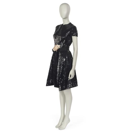 Cocktail dress and stole of black silk brocaded with red and green stylized floral motif