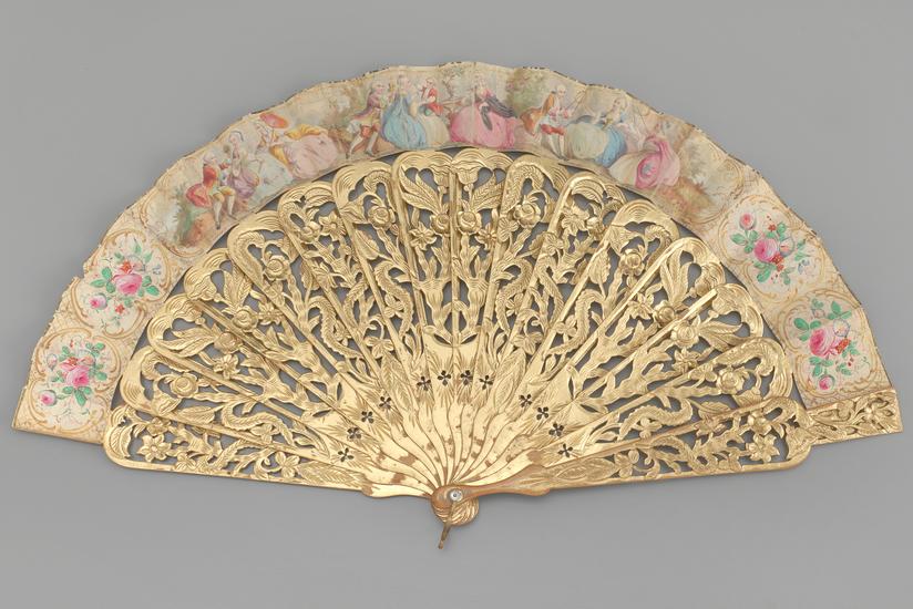 Folding fan of painted leaf depicting 18th-century style figural vignette and musical trophies