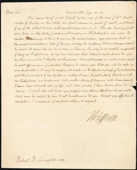 Letter from Thomas Jefferson to Chancellor Robert R. Livingston.