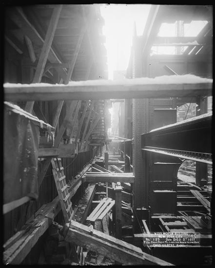 Woolworth Building, looking north along Broadway area [interior showing construction].