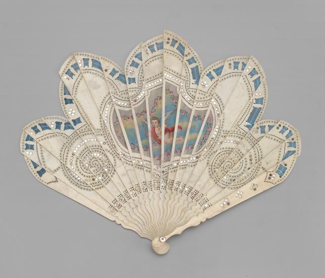 Brisé fan of pierced and carved ivory with painted medallion