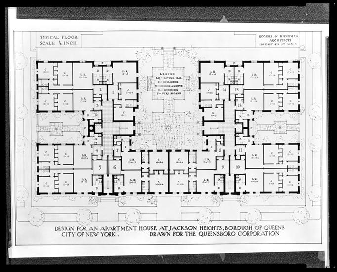 Typical Floor Plan. Building "A" 6-Room Apartments for "Jackson Heights Apartment Corporation" Jackson Heights, Boro' of Queens, New York City