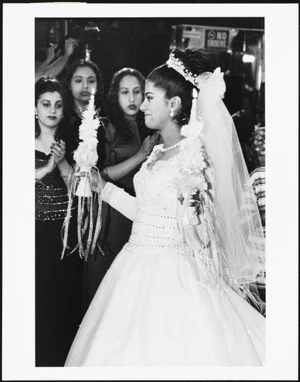 [Women pinning gold coins to bride's dress at a Palestinian wedding at Widdi's Catering Hall.]