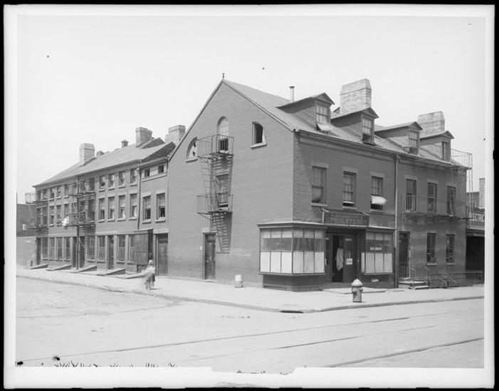 Vicinity of 190 Prince Street. View of model tenements [street scene].showing range in kitchen.