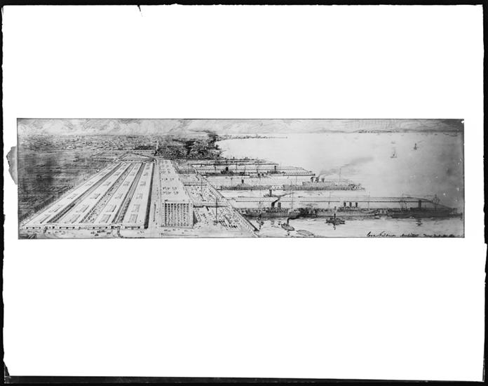 Second set of drawings of Army Base, the pier ends, rendering by Hugh Ferriss, 1918.