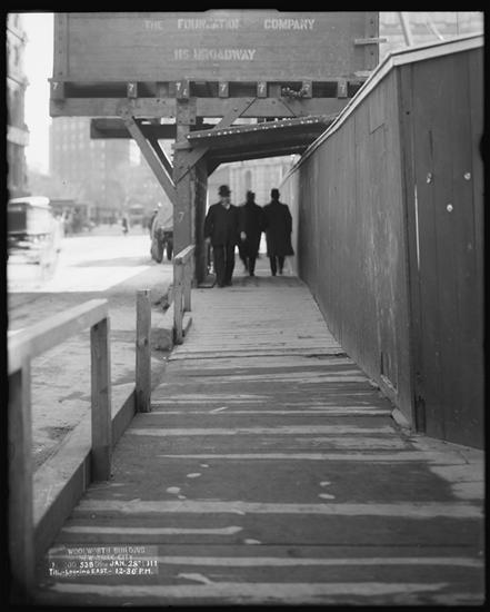 Woolworth Building, Exterior With Men [Men walking past construction zone.]