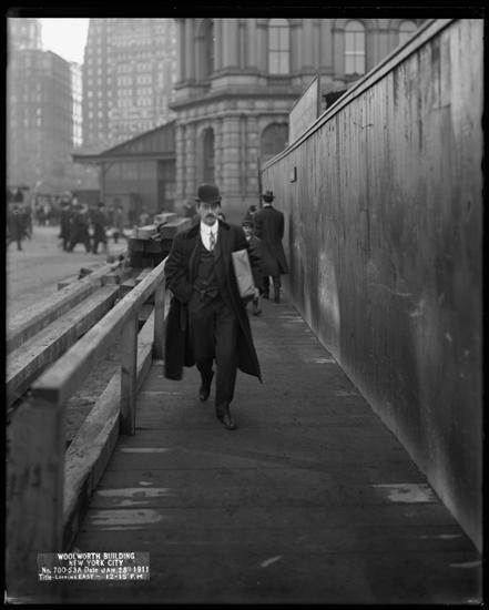 Woolworth Building, Exterior With Men [Men walking past construction zone.]