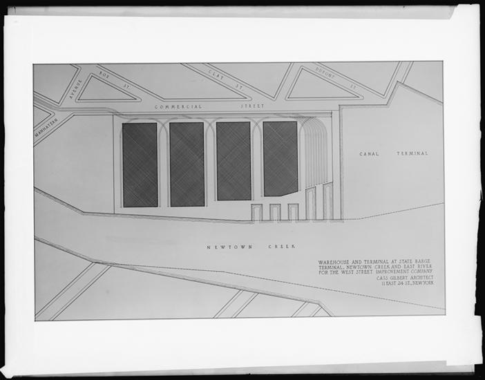 Army base [showing] warehouse, crayon rendering of elevation from docks.