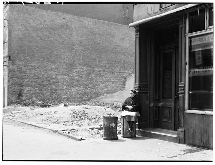 Woman Sitting on a Garbage Can next to a Vacant Lot