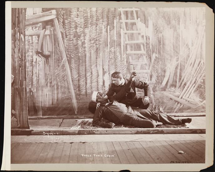 A scene from William A. Brady's production of "Uncle Tom's Cabin" from Harriet Beecher Stowe's novel, presented at the Academy of Music in 1901 and featuring Wilton Lackaye as Uncle Tom and Theodore Roberts as Simon Legree.