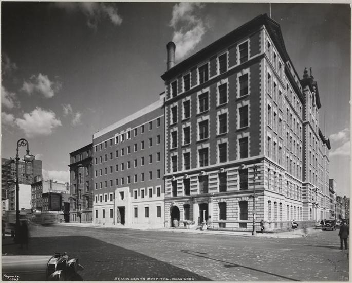 12th Street and 7th Avenue. St. Vincent's Hospital, general exterior of Al Smith Building.