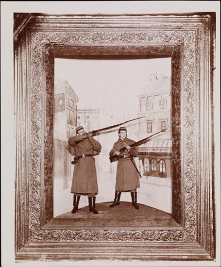 A "Living Picture:" models, in the costume of armed guards, standing before a painted backdrop of a Paris corner.