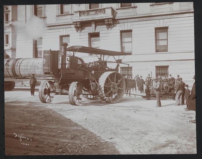 Description Steam-powered tractor pulling a large stone column near the construction site of the Cathedral Church of St. John the Divine on Amsterdam Avenue at 112th Street.