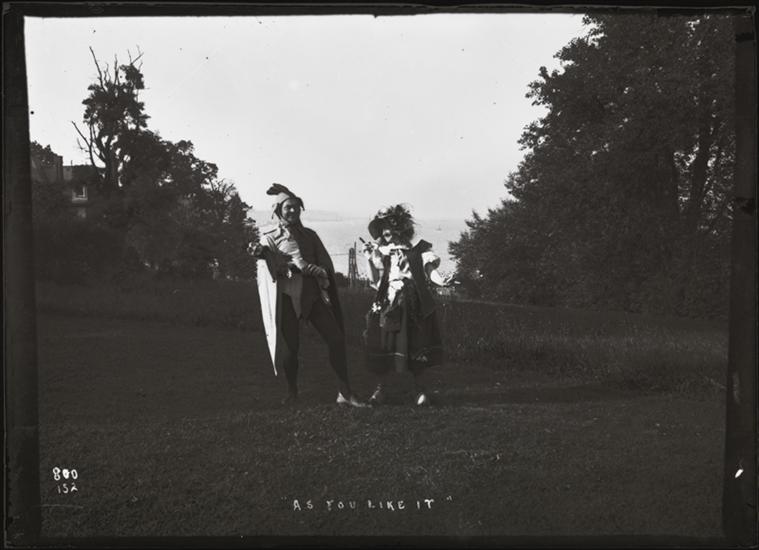 Actors in an open air production of William Shakespeare's "As You Like It" presented on the grounds of what may be the Stevens Residence, Hoboken, N.J.