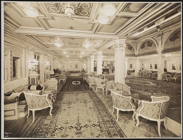 Lloyd Sabaudo Line, S.S. "Conte Biancamano" Pier 95 N.R., First Class Interior, Ballroom Aft End.