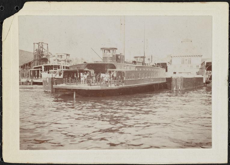 The Weehawken Ferry Story [Ferry terminal with ferry in distance.]