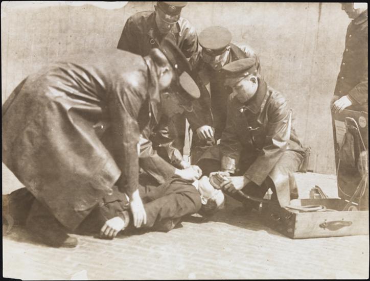 [Firemen receiving inhalator treatment during a Brooklyn tenement fire,]