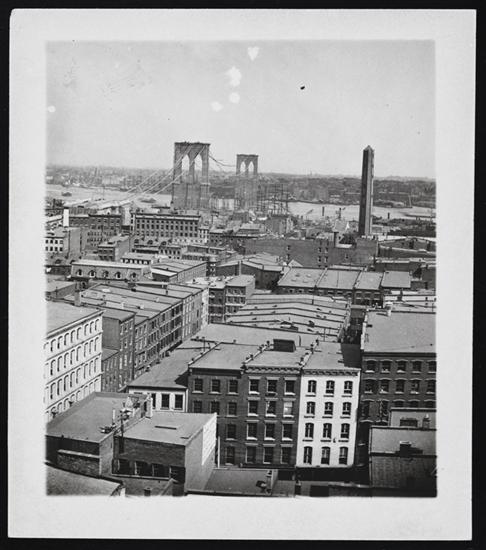 [Cityscape with Brooklyn Bridge under construction in the background.]