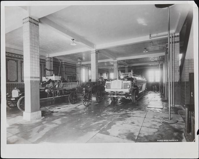 [Horse-drawn fire engine outside the Central Fire Station.]