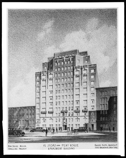 Seven-story block front apartment, pencil rendering by Scheffler.