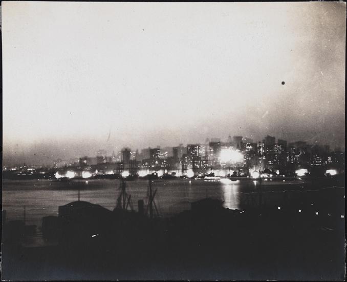 Skyline of Lower Manhattan at Night from Under the Brooklyn Bridge.