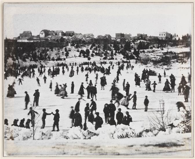 On recto: Skating, Central Park, 1859, showing 59th Street from Fifth to / Seventh Ave., and the filthy squatters' shanties in the "Piggery".; in pencil, on verso: Skating Central Park 1859.