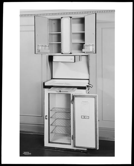 View of kitchen unit with refrigerator, drain board and closet, closed