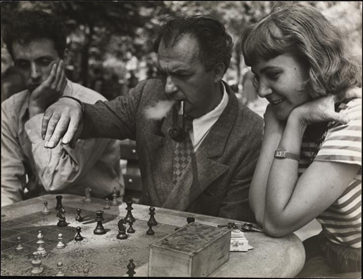 Woman in plaid skirt and sunglasses looking toward photographer, fountain steps, Washington Square Park