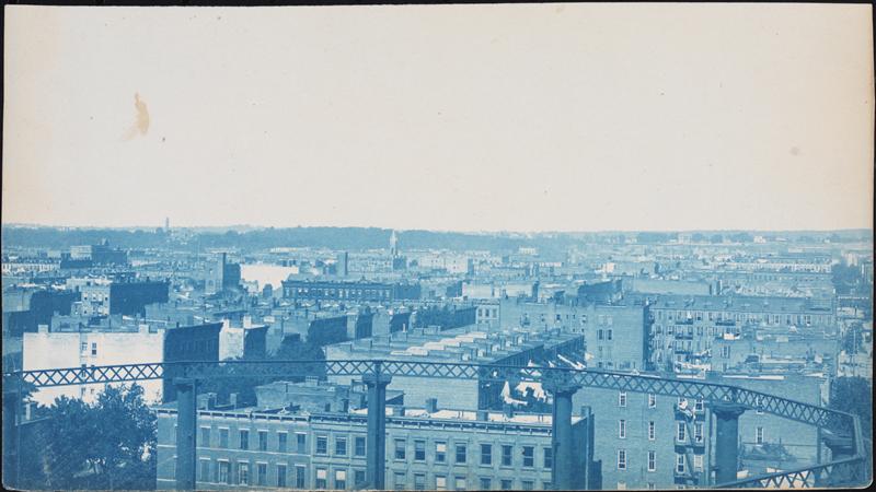 [Cityscape with Brooklyn Bridge under construction in background.]