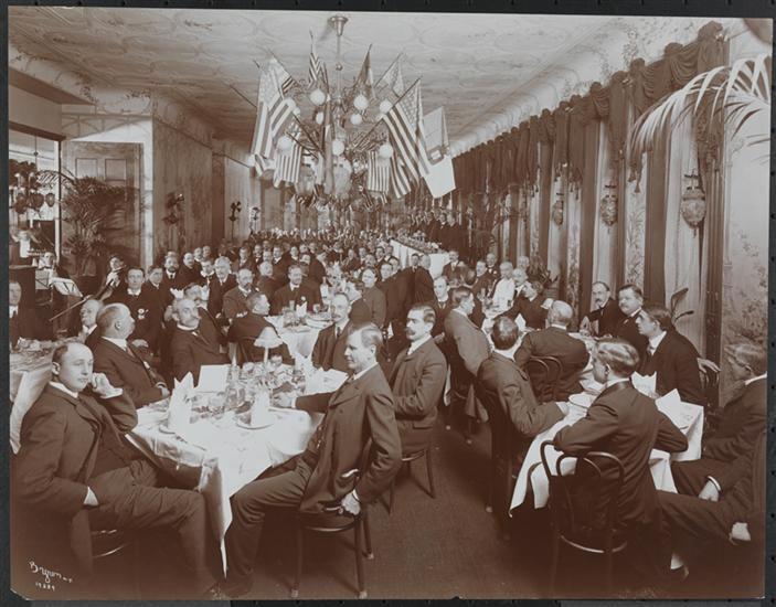 Men seated at tables in a banquet room at the Douglas Lacey & Co. dinner with flags hanging from chandelier.