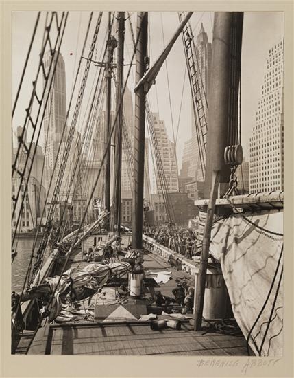 Description Looking from on board the "Theoline" at the front of the ship with a crowd on the dock and buildings of Wall Street in the distance (from left to right): The Farmer's Trust Building, 60 Wall Tower and 120 Wall Street.