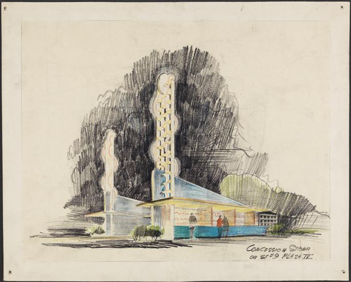 [Colored drawing of views of concession stands, New York World's Fair].