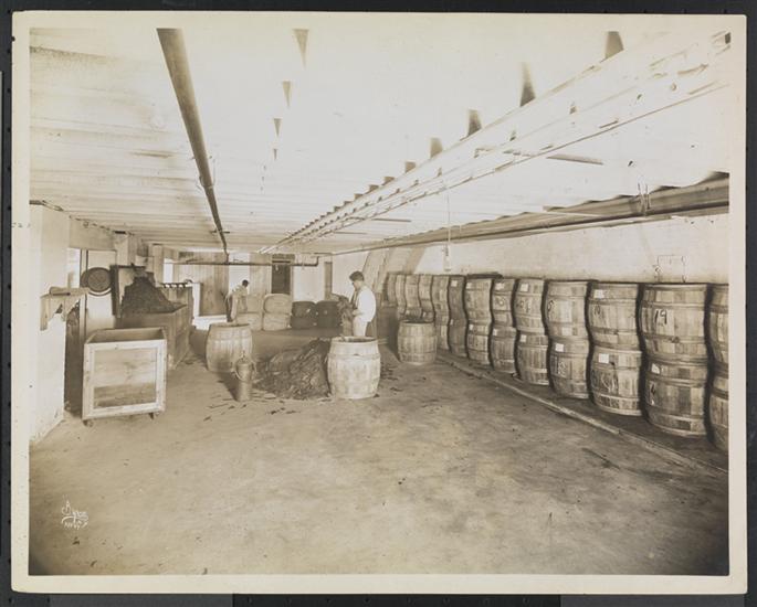 Blending department in the basement of the Lincoln & Ulmer Cigar Co. with two workmen with tobacco leaves, barrels and sacks of tobacco.