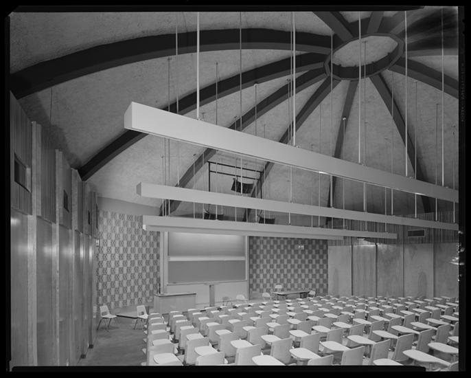 Kissena Boulevard. Queens College, Academic Building No. 1 Social Science Building, view looking S.E. along breezeway toward dome, theater, and lecture hall.