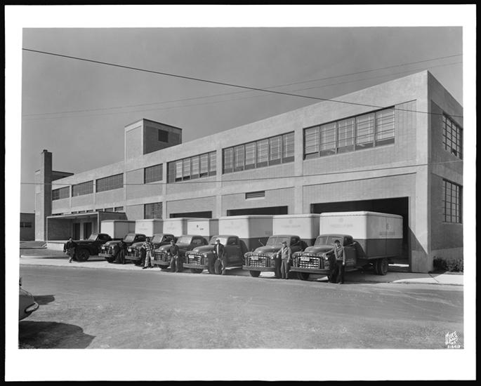Northern Boulevard. Truscon Steel Company warehouse and office building, three trucks loading windows and parts at docks inside warehouse.