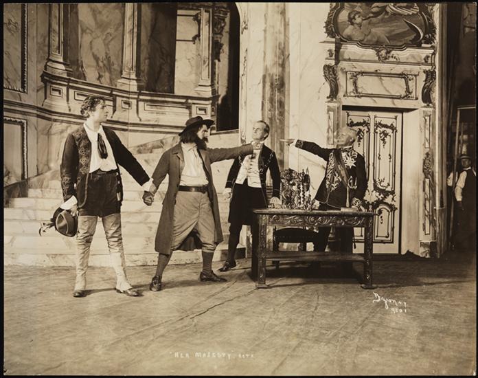 A scene from Act I of J.I.C. Clarke's dramatization of Knight Tompkins play "Her Majesty, The Girl Queen of Nordenmark" presented at the Manhattan Theatre in 1900.