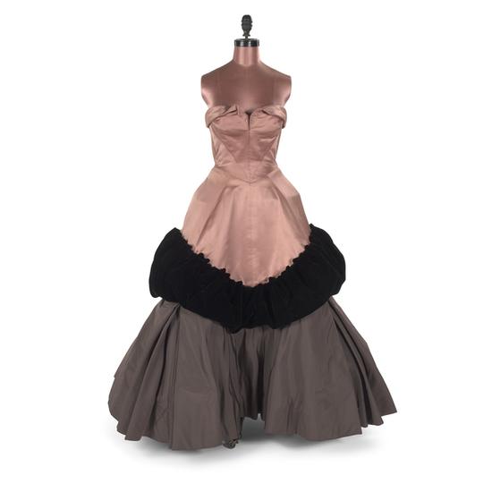 Strapless ball gown in large scale black painted and flocked rose pattern on Prussian blue satin