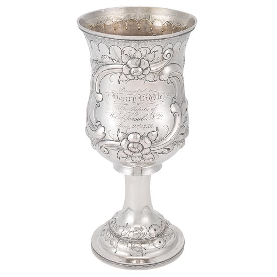 Goblet with spun tulip-shape body, everted lip, gilded interior on stepped circular foot, beading at lip and edge of foot, decorated with repoussé-chased floral motifs on body and foot, and repoussé-chased scroll cartouche on side of body. Inscription: On body: "Presented to/Henry Kiddle/BY/the Pupils of/Ward School No. 2/June 2d 1856". Mark: Struck on underside, incuse: "COIN".