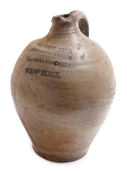 Salt-glazed stoneware jug with gray body, molded loop handle, and decorated with cobalt oxide around handle base.