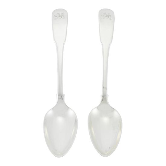 One of a pair of dessert spoons with down-curving fiddle handle, back tipt, egg-shaped bowl and single drop on bowl back. Inscription: Engraved on handle obverse: [Lenox crest.] Mark: Marked on handle reverse: RW [profile head] [lion passant] [date letter C.]