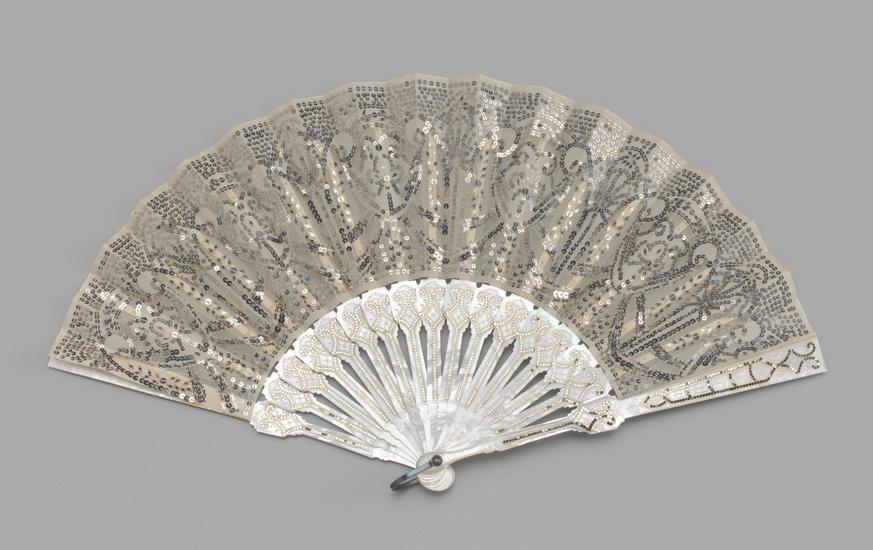 Folding fan of net and silk with applied paillettes