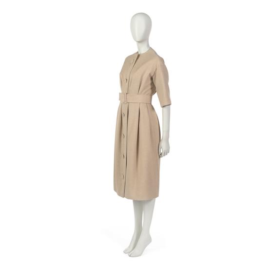 Afternoon ensemble comprising coat and dress in rose pink linen