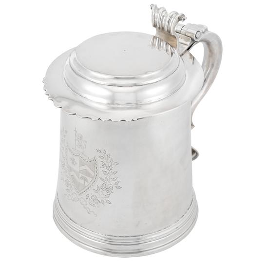 Silver tankard with slightly tapered cylindrical body, applied molded baseband, double-scroll handle with baluster drop below five-knuckle hinge, heart-shaped handle terminal (tip bent), stepped flat-top cover with cast scrolled thumbpiece, and crenate projecting flange opposite handle. Inscription: Engraved with [armorial within bright-cut shield flanked by crossed floral fronds tied below tip of the shield], opposite handle; Engraved on handle terminal "T-ASH"; faint "GA" scratched on the underside of the body; "TA" engraved on the handle below drop.; Scratch weight on base. Mark: Marks: "T [pellet] H" in rectangle struck on the body at either side of the handle.