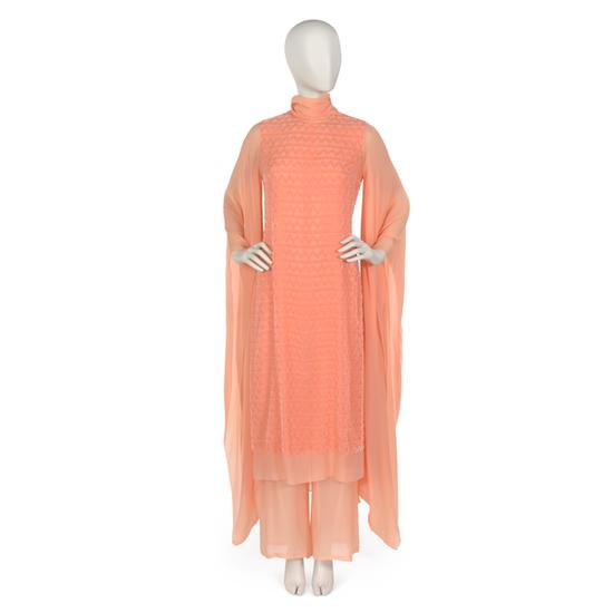 Evening suit comprising black sequined jacket and skirt with pink silk blouse and belt