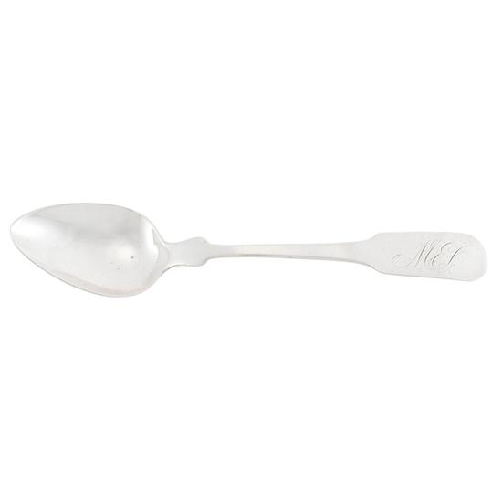 Teaspoon with pointed, egg-shaped bowl, rounded shoulders and downturned fiddle handle with faint back rib. Inscription: Engraved on handle obverse, in script: MES. Mark: Marked on handle reverse: Parisen.