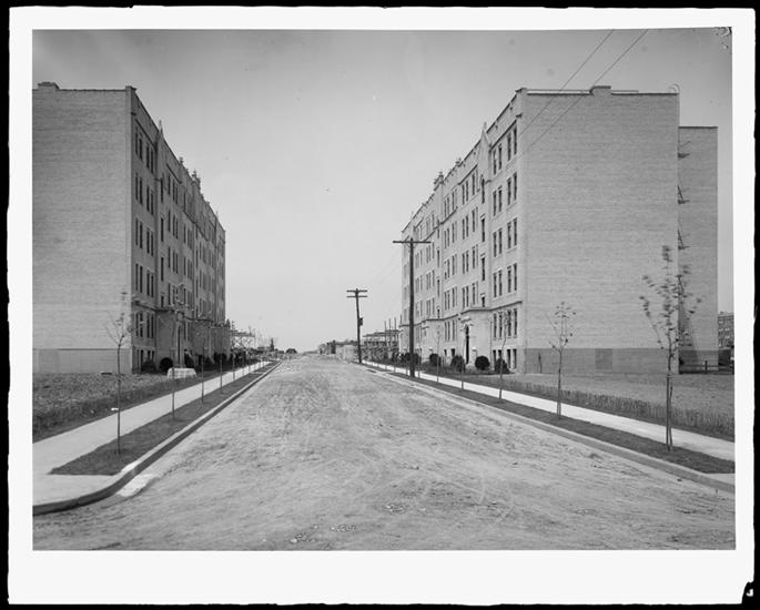 Jackson Heights garden apartments, view through street looking south.