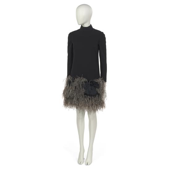Evening ensemble comprising dress and cape of navy blue worsted wool crepe with coq feathers