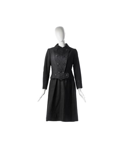 Day ensemble: Suit in black and white strié worsted with coordinating printed silk blouse