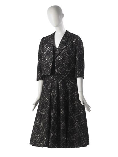 Day dress and matching Tyrolean-style jacket in black and grey slubbed silk