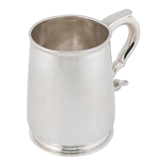 Cann with center punch on underside of base, body with slightly bulbous sides tapering upward to everted lip, on circular molded footring, S-scroll handle with furl, double drop at upper juncture with body, and oval plate at lower juncture. Inscription: Engraved on the underside of the base: "M.V.C"; Later inscription: "Married/Peter Jay/Jan.20 1728". Mark: Struck on body near lip to left of handle, conjoined: "HB" in circular enclosure.
